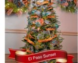 Savor the flavor of Mexico in the tree FELIZ NAVIDAD. Butterfly flower clips are surrounded by pinata bird ornaments, pink striped and aqua balls, and painted pottery bells and pots. Ribbons of velvet paisley accentuate floral stems, glittered flower sprays, and green glitter loops.